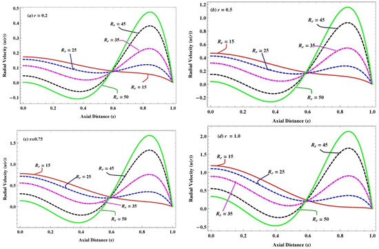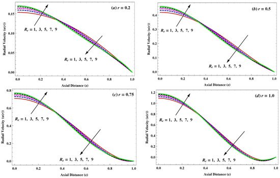 (a–d) Variation in radial velocity due to Reynolds number when and for .