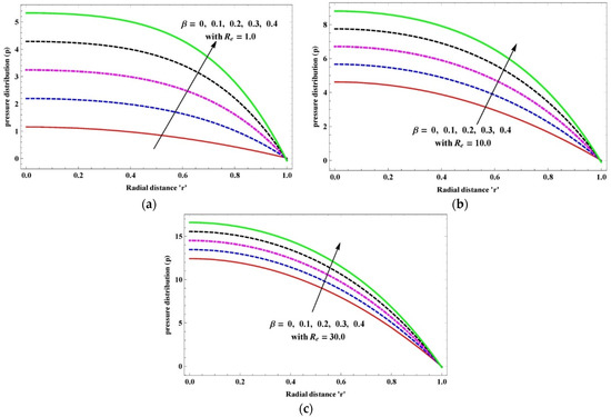 Figure 9a–c demonstrates the influence of the various Reynolds numbers with variation in the slightly viscoelastic parameter on the pressure distribution. The pressure distribution escalates with variation in the slightly viscoelastic parameter, and it greatly surges when increases. It is observed that the escalation in pressure indicates the thickness of the fluid; this fluid is mostly called shear-thickening fluid.