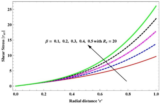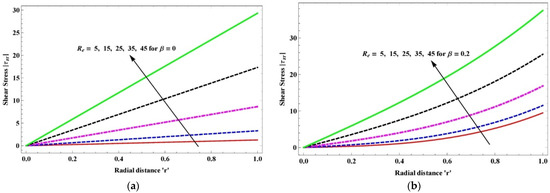 The effects of inertia on the wall tangential shear stress for viscous and slightly viscoelastic fluids are shown in Figure 10a,b. It is observed that tangential shear stress increases the viscoelastic fluid slightly more than the viscous fluid under the increment in Reynolds number and the maximum value occurs on the edges. Further, the tangential shear stress for viscous fluid and slightly viscoelastic fluid extends linearly and nonlinearly with the increase in Reynolds number along the radial direction, respectively. This is in nice consensus with Newton’s law of viscosity. Figure 10 illustrates the change in shear stress due to the variation in along at . Tangential shear stress extends accordingly with the rise in ; this is the behavior of shear-thickening fluid.