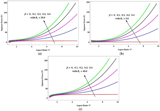 The change in squeeze force is exemplified in Figure 12a–c due to the slightly viscoelastic parameter along (a) (b) (c) . The squeeze force surges because of the increment in B with the inertia effect, but it has a slight increase with the variation in Reynolds number. The increment in increases the thickness of the fluid, so it requires more force to squeeze the slightly viscoelastic fluid. Thus, the fluid behavior indicates the shear-thickening fluid.