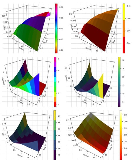 Plots of mean, var, SK, KU, CV and ID in 3D for the KMKE model.