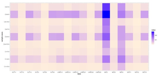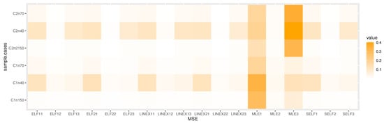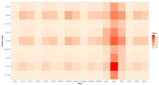 Figure 6, Figure 7 and Figure 8 show heatmaps of MSE for parameters of the KMKE distribution, where the X-axis shows the MSE based on different estimation methods with each parameter , and , respectively (MLE1 is a MSE for , MLE2 is a MSE for and MLE3 is a MSE for ), while the Y-axis shows the MSE based on different cases and sample sizes, for example: C1n40 is an actual value of the parameter in Table 3 where , and n = 40; C1n70 is an actual value of the parameter in Table 3 where , and n = 70; and C2n70 is an actual value of the parameter in Table 3 where , and n = 70.