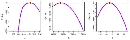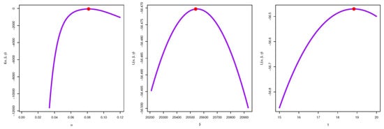 In this section, we focus on how the maximum likelihood technique (see [87]) can be employed to estimate the parameters , and for the KMKE model. Suppose that is a random sample of size n from the KMKE model (7). Then, the total log-likelihood function for is supplied as below