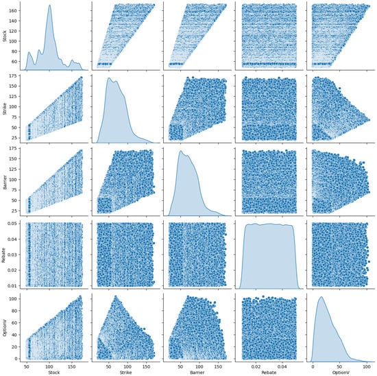 In Figure 1, we consider the visualization using the seaborn library in connection with the pairplot function to plot a symmetric combination of two main figures, that is, the scatter plot and the kernel density estimate (KDE). The KDE plot is a non-parametric technique mainly used to visualize the nature of the probability density function of a continuous variable. In our case, we limit these KDE plots to the diagonals. We focus on the relationship between the stock, strike, rebate and the barrier with the extended Black–Scholes price (OptionV) for the rebate barrier options. From the data distribution for the feature columns, we notice that the sigma, time and rate columns could be ignored. This is because the density distribution shows that these features are basically uniform, and the absence of any variation makes it very unlikely to improve the model performance. Suppose we consider this problem as a classification problem; then, no split on these columns will increase the entropy of the model.