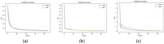 Train/Test LOSS values for Models A1, A2 and A3; (a) LOSS—Model A1; (b) LOSS—Model A2; (c) MAE—Model A3.