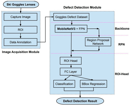 - Fine-tuning of the integrated object detection model that combines Faster R-CNN, FPN, and MobileNetV3 by implementing the following modifications: replacement of the default ResNet50 backbone with a combination of MobileNetV3 and feature pyramid network (FPN) to optimize computational efficiency and performance; adjustment of the region proposal network (RPN) hyperparameters to accommodate the detection of minuscule defects; and a reduction of the output channel count in the FPN to enhance computational performance without sacrificing accuracy.