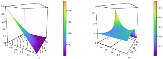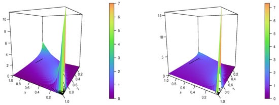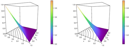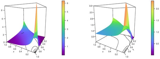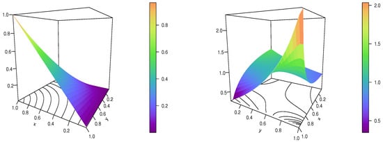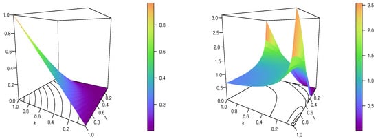 where is a tuning parameter and and are differentiable continuous functions. Of course, the admissible values for are directly connected to the definitions of and . The form in Equation (1) is general. In particular, it includes the Gumbel–Barnett copula, obtained with and (see [5]), and the Celebioglu–Cuadras copula, which appears by taking and (see [19,20,21]). Furthermore, in the very special case where , and and , we obtain