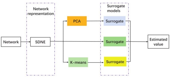 In addition, heterogeneous input can foster diversity in integration, leading to the extraction of various features from the original data. The extracted features and the original data can be combined to form the training data of the surrogate model. To achieve this, principal component analysis (PCA) can be employed as it can effectively extract the major components with minimal computational cost. The second step is to cluster the embedded information using K-means clustering with the number of clusters set to twenty percent of N. As demonstrated in [34], the clustered embedded data, which contains essential connectivity information, is essential for interpreting information from networks. The original data obtained after applying SDNE for dimensionality reduction, as well as those obtained through PCA dimensionality reduction and those obtained after clustering are all used to train the surrogate model.