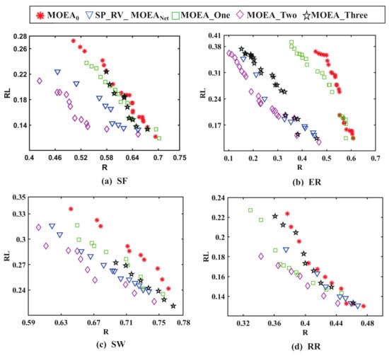 Figure 3 shows that the results obtained by are less satisfactory on four types of networks. The performance of the existing algorithm is clearly much better than . Under the methods designed in this paper, , , and also have a better performance than . Preliminarily, this shows that the non-dominated solutions obtained after adding the surrogate model in the optimization process under the same algorithmic framework are better than those of . The performance of is second only to in SF, ER, and SW networks, but in RR, the performance of is only better than . However, in terms of computational cost, is too time-consuming, and several other methods consume much less computational time than , as shown in Table 5. The method under D-S theory outperforms several other tested methods and achieves a good balance between search and diversity. It can be seen from Table 5 that the more surrogate models there are, the more time-consuming the method is.