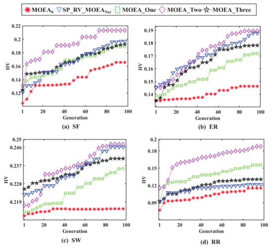 The HV values is used to determine the performance of multi-objective optimization, and the larger the HV values, the better the performance of the method. From Figure 4, it can be seen that the performance of is better, as the HV curve of ultimately remains above other methods.