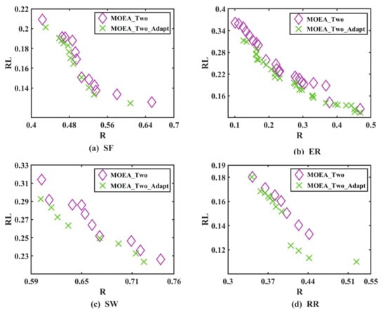 The experimental results in the preceding section show that the network controllability robustness obtained by assisted by the multi-objective evolutionary algorithm on SF, SW, ER, and RR are relatively better. Therefore, during the adaptive updating process, the number of surrogate models is set to two. The experiments in this section compare the controllability robustness of with that of . Figure 5 depicts the non-dominated solutions obtained on four types of complex networks, and Table 4 shows the time consumption and average HV values of the two methods.