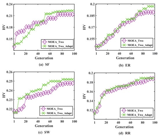 Here, we compare the previously obtained method’s HV curve with the adaptively updating method. Similarly, when evaluating the performance of the method, the higher the HV value, the better it is. From the Figure 6, it can be seen that the adaptively updating method ultimately remains above the other HV curve.