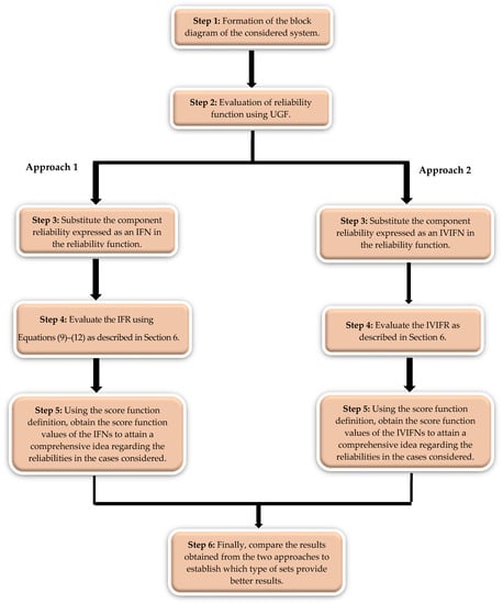 In this section, two types of methodologies involving the IFS are presented. The reliability of the system will be evaluated by implementing two different methods. Firstly, we shall determine the reliability with the aid of IFNs and their operations. Secondly, we shall proceed to determine the desired reliability using the IVIFNs and their respective operations. The adopted methodology has also been explained using a flowchart shown in Figure 2.