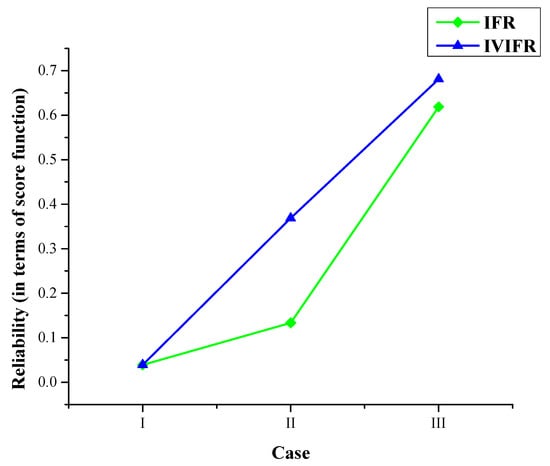 In all the cases considered, it is evident that the assumed component reliability of Case I is the lowest, while the highest corresponds to Case III in both IFS and IVIFS. In other words, the component reliabilities follow the order Case I < Case II < Case III. In addition, it seems that the resulting system reliabilities follow the same pattern, i.e., Case I < Case II < Case III for both IFR and IVIFR of the system. This signifies that as the component reliability increases, the system reliability also increases, which is evident in both Table 5 and Figure 3. From Figure 3, it can also be seen that the IFR increases significantly from Case II to Case III, whereas the IVIFR increases linearly from Case I to Case III.