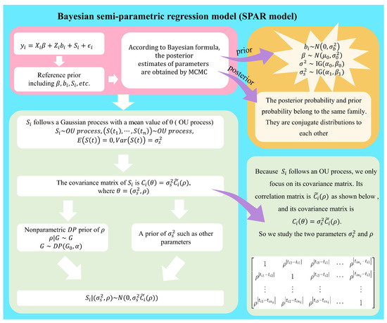 Semiparametric linear mixed models generalize traditional linear mixed models by modeling a covariate effect with a nonparametric function and parametrically modeling other covariate effects. Semiparametric linear mixed models mainly use frequentist methods for statistical inference and assume normal random effects [10]. In this paper, we employ a Bayesian semiparametric framework for linear mixed models given by Quintana et al. [4] by imposing stronger conditions on the random effect to obtain an explicit solution to posterior distributions of the model parameters and fast convergence of the MCMC algorithm in the posterior inference of model parameters. The proposed framework generalizes the default priori of variance components and adjusts the inference of fixed effects associated with nonparametric random effects. The latter includes the extrapolation of nonparametric mean functions over time [11,12]. The stochastic process approach in [4] is a good choice for characterizing the intragroup correlation. The Gaussian process (GP) covariance has an exponential form and is uniquely determined by two parameters. GP can specify autoregressive correlation (the AR covariance structure, [13]). A nonparametric Dirichlet process (DP) priori assigned to the covariance parameter results in an Ornstein–Uhlenbeck process (OUP). A partial Dirichlet process mixture (DPM) is performed on the OUP. By imposing stronger conditions on the random effect and decomposing the OUP into some single Gaussian variables, we can substantially simplify the MCMC sampling in the posterior inference. The framework of our proposed semiparametric autoregression model (SPAR) is demonstrated in Figure 1.