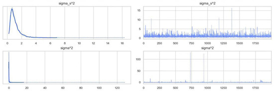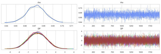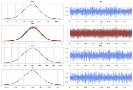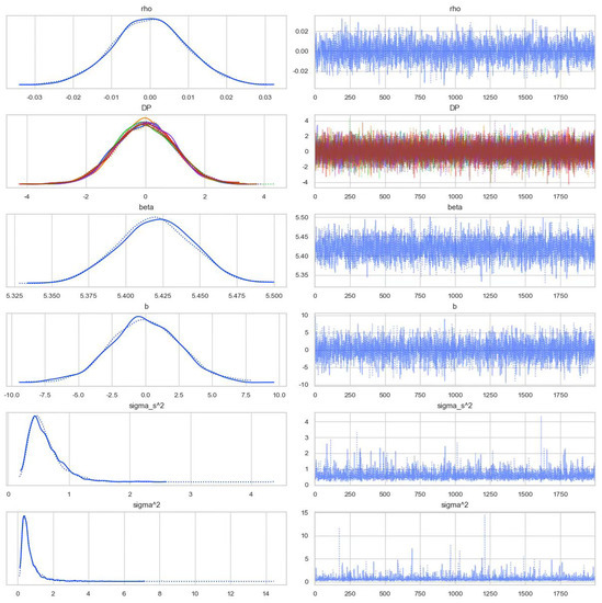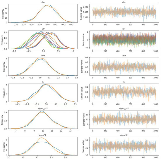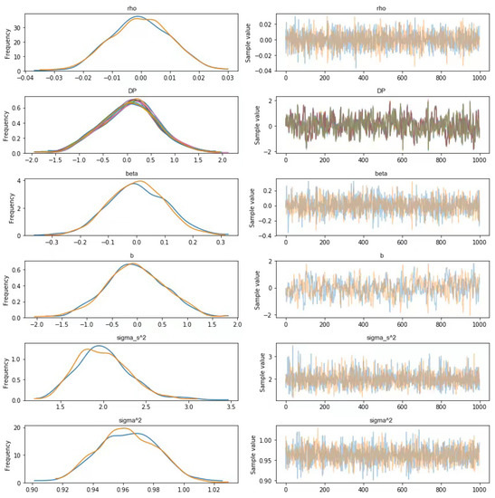 For the case of the AR covariance structure, each parameter in the model is sampled and estimated using the MCMC method. The last 1000 iterations are taken to draw the posterior sampling trend diagram, as shown in Figure 19: