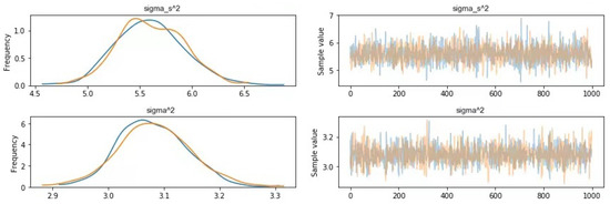 For the case of independent structure covariance, the MCMC method is used to sample and estimate each parameter in the model. The last 1000 iterations are taken to draw the posterior sampling trend graph shown in Figure 25.