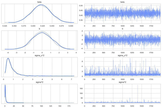 For the case of CS covariance structure, each parameter in the model is sampled and estimated using the MCMC method. The last 1000 iterations are taken to draw the posterior sampling trend diagram, as shown in Figure 16.