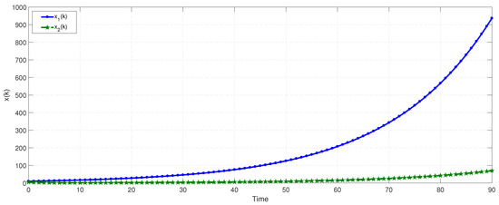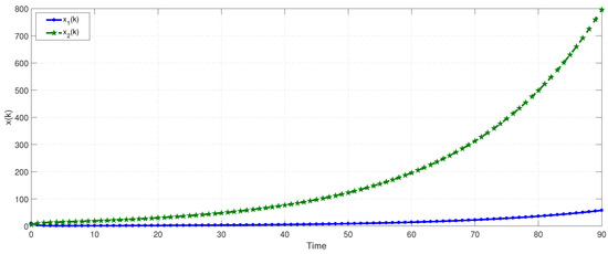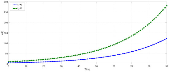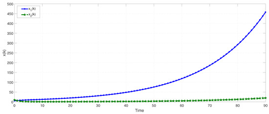 It is easy to see that and . Hence, this system is positive by using the assumption and Lemma 1. We assign the initial state and the matrices