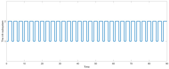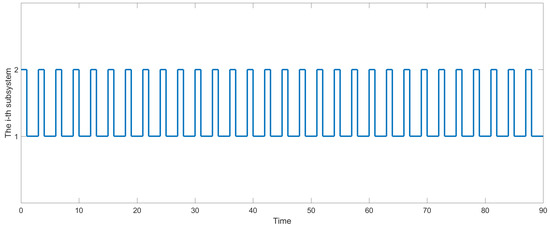 and . Hence, this system is GUAS under the switching signal by Theorem 1. The corresponding switching signal and the state responses of the system are presented in Figure 3 and Figure 4, respectively. Therefore, it can be seen that our designed switching signal can ensure the RAS of the system effectively. However, owing to the existence of TVD, the corresponding results in [20,26] cannot be applied to this example. In addition, it should be pointed out that our results are relatively less conservative and more general than [29] because of the existence of the IUs and the MDDT switching approach.