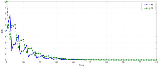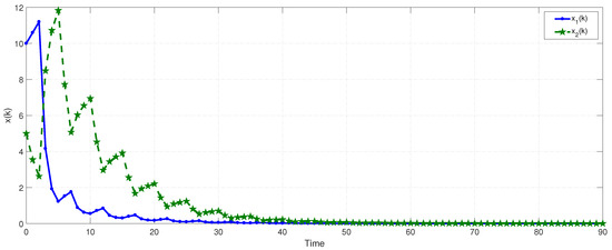 and the time constants and . Consequently, the considered system is GUAS under the switching signal . Finally, the state responses of the system with respect to (in Figure 7) are shown in Figure 8.