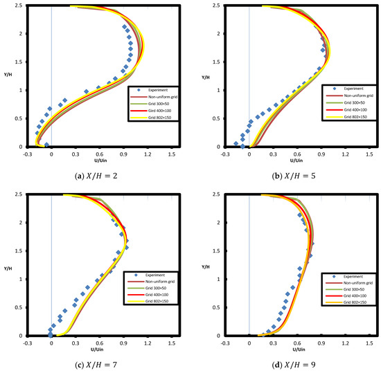 A comparison with the experimental results of Singh and Azad [26] will be introduced below to validate the new technique called cell cutting, it works to get closer and reach a suitable solution. The diffuser’s inlet radius , down-stream pipe radius , and diffuser length are all factors to be taken into account in this situation. The inlet velocity is Figure 6, indicates the axial velocity in positions . and is the location measured behind the step. We use the different resolution to illustrate the grid independence study with