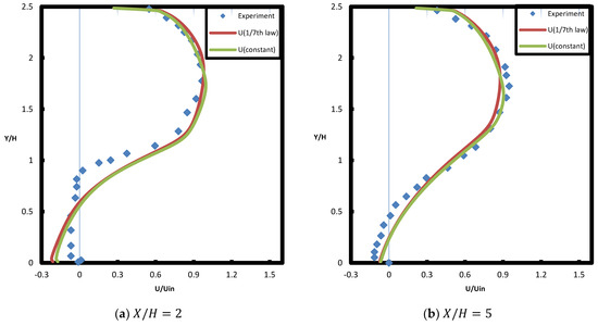 For the inlet condition, the turbulent kinetic energy and dissipation rate are considered to be constant, and the flow velocity is assumed to be a constant ( or a 1/7th power law profile equation [9] in x-direction and = 0 in y-direction. With wall-function approximation, the no slip boundary requirements are assumed for solid walls [42].