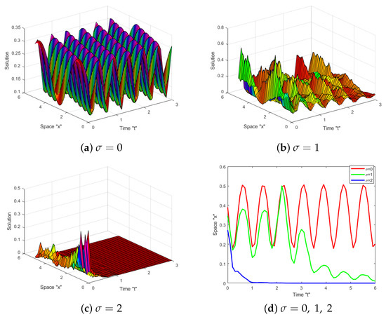 (a–c) show the 3D shapes of the solution to Equation (26) for various values of (d) Depicts a graph in two dimensions for these values of .