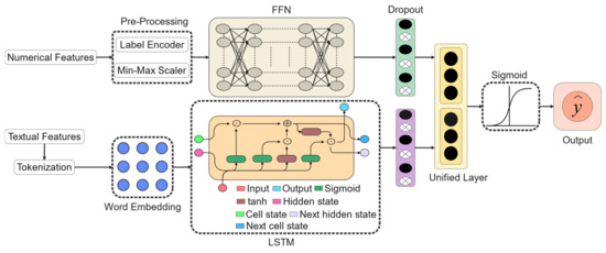 In order to utilize both numerical features and textual features for detecting malicious domain names, we propose a combined deep learning-based model (hybrid feed forward network (FFN)-long short-term memory (LSTM) [12] model that preserves the advantages of both numerical and textual features. The network structure of the hybrid FFN-LSTM model is shown in Figure 1. The original dataset was split into numerical and textual features that were fed into the model as separate inputs. Individual learners were then built based on numerical and textual features, and the outputs of the individual learners were spliced together in parallel to form the input to a unified learner consisting of a fully connected neural network.