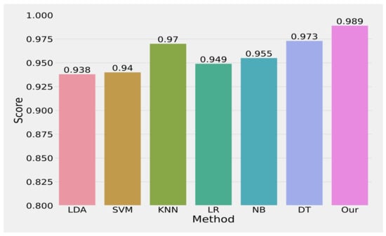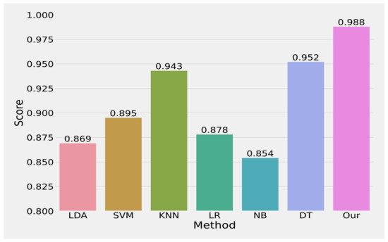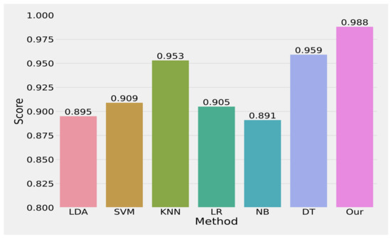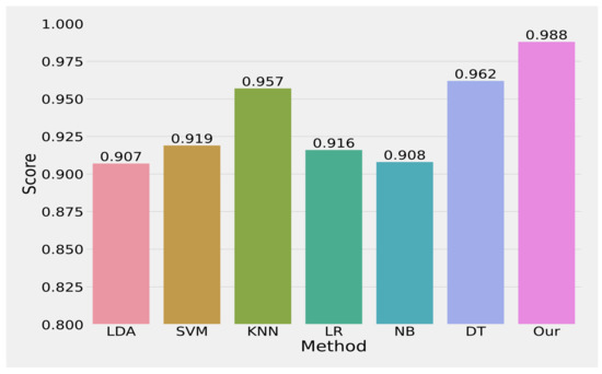 The average precision value improvement by our approach over all baseline approaches is 0.051%, 0.049%, 0.019%, 0.04%, 0.034%, and 0.016% compared with LDA [2], [20,21,22,23], SVM [2,24], KNN [2,25,26,27], LR [2,28], NB [2,29], and DT [2,30], respectively. In terms of recall, our approach obtains 0.988%. The average recall value improvement by our approach over all baseline approaches is 0.119%, 0.093%, 0.045%, 0.11%, 0.134%, and 0.036% compared with LDA [2,31], SVM [2,24], KNN [2,25,26,27], LR [2,28], NB [2,29], and DT [2,30], respectively. In terms of F1-Score, our approach obtains 0.988%. The average F1-Score value improvement by our approach over all baseline approaches is 0.093%, 0.079%, 0.035%, 0.083%, 0.097%, and 0.029% compared with LDA [2,31], SVM [2,24], KNN [2,25,26,27], LR [2,28], NB [2,29], and DT [2,30], respectively. In terms of accuracy, our approach obtains 0.988%. The average accuracy value improvement by our approach over all baseline approaches is 0.081%, 0.069%, 0.031%, 0.072%, 0.08%, and 0.026% compared with LDA [2,31], SVM [2,24], KNN [2,25,26,27], LR [2,28], NB [2,29], and DT [2,30], respectively. All of these results indicate that the unified learning approach is more effective compared with the baseline approaches.