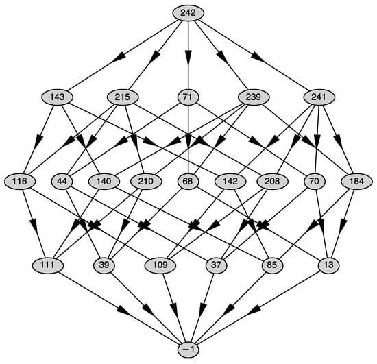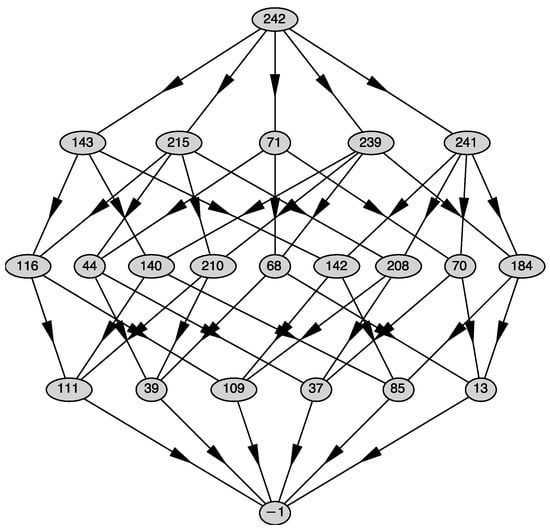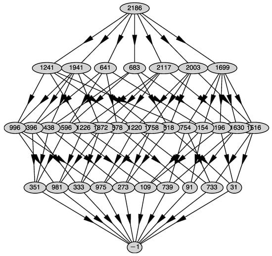 Each generalized face of is presented by its number j in an oval. Numbers j are given by the program automatically. The top line of Figure 1 contains the whole polyhedron ; the next line contains all the two-dimensional faces .