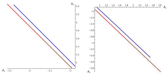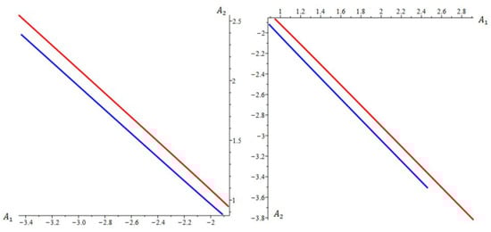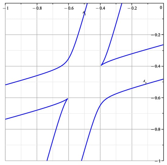 Figure 11 at (i.e., ) shows the upper and lower sections of the curve (46) and (47) for . The sections where are discarded, because they are affected by singularities of the singular points and . We observe that these curves are like parallel line segments and almost coincide. In the corresponding in Figure 12 in [25], similar branches merge.