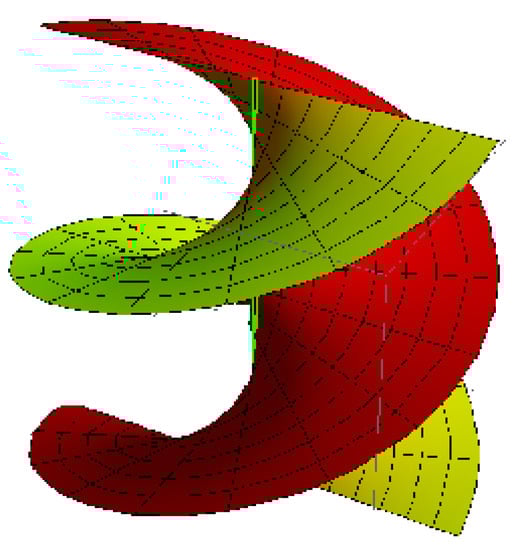 which is a one-parameter family of helicoidal surfaces. If we set ,, and , then an element of such a family can be attained (Figure 1).