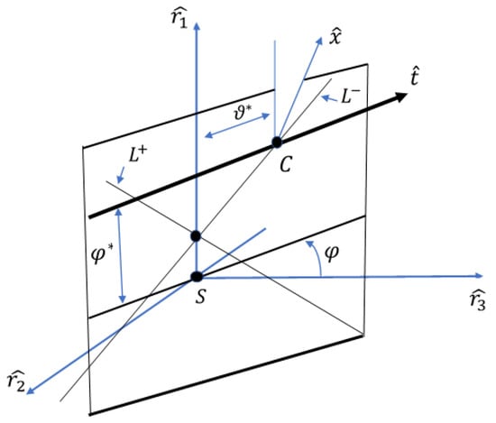 Equation (52) is linear in the coordinates and of . Thus, for a one-parameter spatial movement , the lines in a given stationary direction in the space lie on a plane. As shown in Figure 7, the angle identifies the central normal ; thus, Equation (52) defines two lines and in the plane spanned by and the ( and are conformable to the inflection circle in planar kinematics). If the distance over the is taken as the independent parameter, then Equation (52) becomes
