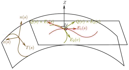 where , and are the geodesic curvature, the normal curvature, and the geodesic torsion, respectively [51,54].