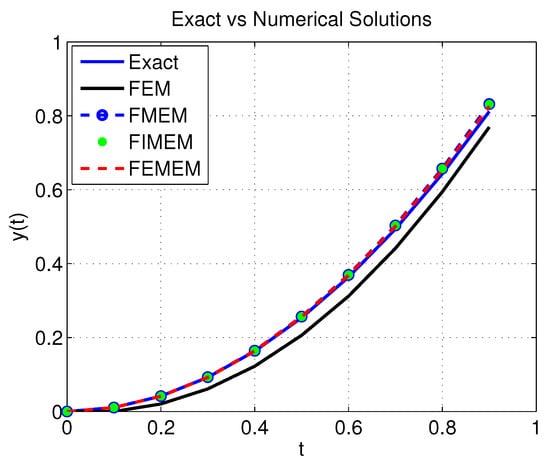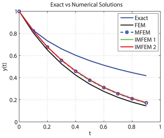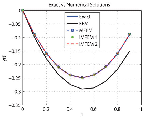 where . The exact solution of the above problem is . Herein, we applied Formulas (19) and (21) to solve problem (23), and hence generated Figure 3. The figure illustrates the numerical solutions of the considered problem generated by using FEM, MFEM, IMFEM 1, and IMFEM 2 according to and .