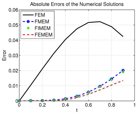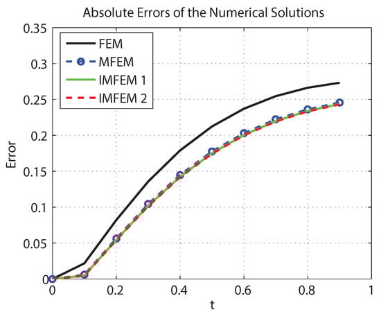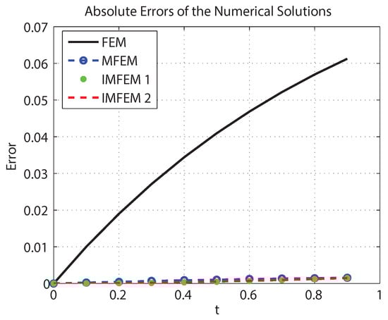 where . The exact solution to the above problem is given by . In a similar manner to the previous two examples, we applied Formulas (19) and (21) to solve this problem. As a result, Figure 5 was then generated, which illustrates the numerical solutions of such a problem using FEM, MFEM, IMFEM 1, and IMFEM 2 with and . In the same regard, we plotted Figure 6 and produced Table 3 for the purpose of highlighting the absolute error values for the numerical solutions generated by all considered methods.