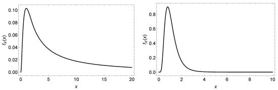 Plot of the pdf given in (11) for special values of its parameters. Left panel, and right panel.