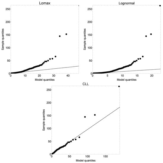 Now we use the classic Danish fire insurance dataset. The dataset contains 2492 fire insurance losses in millions of Danish kroner (DKr) from the years 1980 to 1990 inclusive, adjusted to reflect 1985 values. This dataset may be found in the “SMPracticals” add-on package for R, available from the CRAN website http://cran.r-project.org/ (accessed on 14 May 2023). Estimates obtained by maximum likelihood estimation and standard errors (in brackets) were reported in [24]. These values are , , and . Also the value of the mixing weight is . We have also fitted the lognormal and Lomax distributions to this dataset for comparison purposes. For the former model, the estimates are and whereas for the latter distribution, these values are and . Below in Figure 2, we have drawn the QQ plots of the three models. From the QQ plots shown below, it can be seen that the sample quantiles are larger than the model quantiles for the lognormal and Lomax distribution, thus both models underestimates the empirical quantiles. The lognormal distribution provides a better fit than the Lomax distribution in the lower and middle parts of the empirical distribution. The latter model improves the behaviour of the lognormal one in the middle-to-large part of the sample distribution. By combining the two models under the composite methodology, the resulting model improves the fit to data not only in the middle and top parts of the distribution but also in the upper tail.
