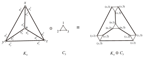 ([18]). Let be a -regular graph with vertex set and edge-set , be a -regular graph with vertex set and edge-set . For every vertex , label the edges of incident with x with . The replacement product graph has vertex set , two of its different vertices and , where and , are adjacent if and only if either and , or and .