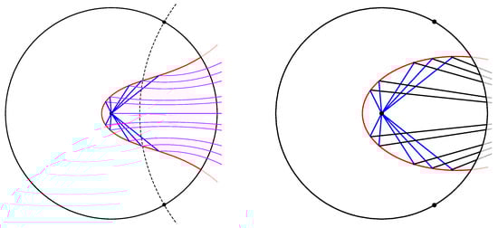 Perhaps the best way to see that the curves in the Klein model are correct is to compare the two pictures via the Klein-to-Poincaré map : this is the unique isometry from the disc with the Klein metric to the disc with the Poincaré metric that keeps the ideal boundary pointwise fixed []; it takes the straight line segment between points on the boundary to the geodesic between the same two points in the Poincaré disc. As we have chosen the focus inside the disc to be at the origin, the rays from the focus coincide (but not pointwise). The reflected rays meet the ideal boundary at the same point in the two models (Figure 2, left).