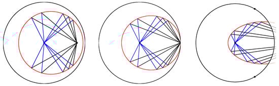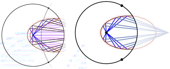 The notion that a focus may be located at an ultra-ideal point may be justified by considering a variable mirror with one fixed focus at the origin in the disc, while the other focus is allowed to move across the ideal boundary, as seen in Figure 3 and Figure 4. When the movable focus reaches the ideal boundary, the reflected light rays become parallel, in the hyperbolic sense, i.e., they meet at the ideal point. If we “keep going” beyond the ideal boundary, the reflected rays now disperse. Note that the mirror has only one branch in the hyperbolic plane; hence, the name “semihyperbola”. The same picture in the Klein model would show the rays meeting at the ultra-ideal focus, as we saw in Figure 2. In the extended hyperbolic plane, this process is continuous.