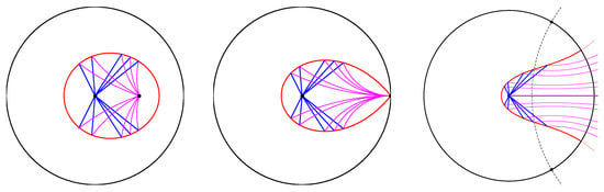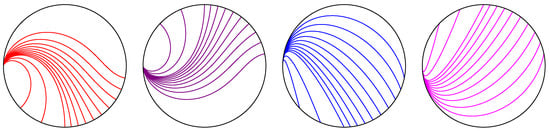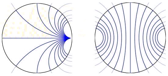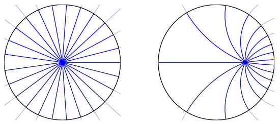 In the hyperbolic plane, there are three types of such fields. An elliptic geodesic field consists of geodesic rays emanating from (or converging to) a point in ; its orthogonal trajectories are circles (curves of constant curvature ) (Figure 5). A hyperbolic geodesic field consists of rays orthogonal to a fixed geodesic (Figure 6, right): such a field’s other orthogonal trajectories have constant curvature . The transition between these two types consists of rays asymptotic to an ideal point. For such a parabolic geodesic field, the orthogonal trajectories are horocycles, which have curvature (Figure 6, left).