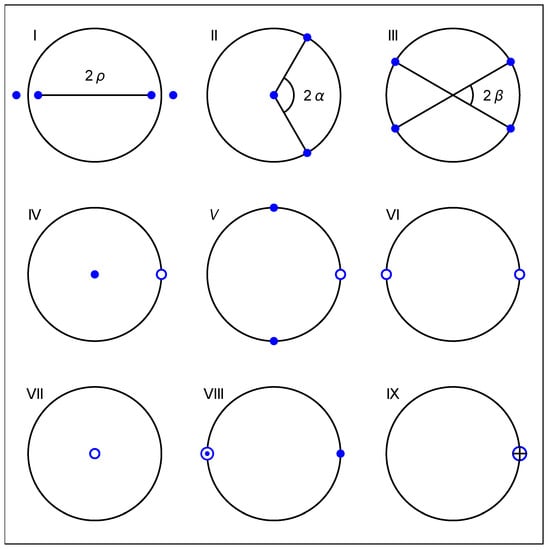 For example, Type I arises when there are four poles of the form , : in this case, the midpoint of the geodesic arc of length can be moved to the origin by isometry, and then rotation places its endpoints on the real axis, with equal distance from the origin, as in Figure 7.