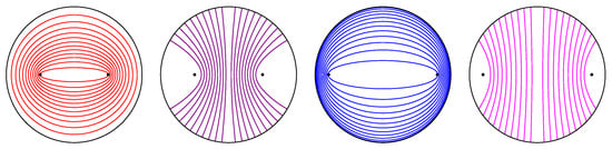 - Two poles in the disc, and their reflections in the circle (Figure 8).Figure 8. I. Ellipse and hyperbola. The left two parts show the horizontal (red) and vertical (magenta) trajectories in the Poincaré disc model; the right two parts show the horizontal (blue) and vertical (pink) trajectories in the Klein model.The quadratic differential is equivalent to