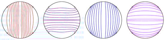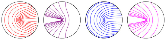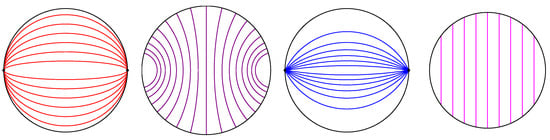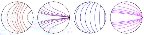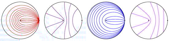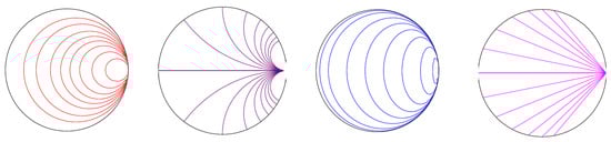 - Two double poles on the circle (Figure 13).Figure 13. VI. Equidistant curves. The left two parts show the horizontal (red) and vertical (magenta) trajectories in the Poincaré disc model; the right two parts show the horizontal (blue) and vertical (pink) trajectories in the Klein model.The quadratic differential is equivalent toThe trajectories consist of a hyperbolic straight line and the equidistant curves to the line (these being curves of constant curvature less than 1). The orthogonal trajectories are the geodesic field of lines orthogonal to the given line.