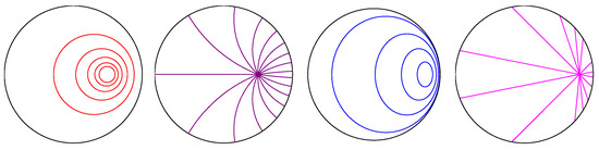 - A double pole in the disc, and its reflected double pole (Figure 14).Figure 14. VII. Circles. The left two parts show the horizontal (red) and vertical (magenta) trajectories in the Poincaré disc model; the right two parts show the horizontal (blue) and vertical (pink) trajectories in the Klein model.The quadratic differential is equivalent toThe trajectories are concentric circles. If the center is chosen to be at the origin, the Euclidean, Poincaré, and Klein models are identical; otherwise, the curves in the Poincarè disc are circles, and the Klein circles are ellipses. The orthogonal trajectories are rays from the center.