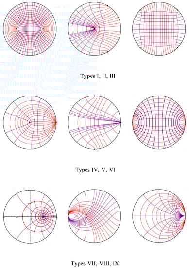Figure 17 displays the nine families of horizontal and vertical trajectories in the Poincaré disc.