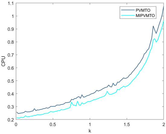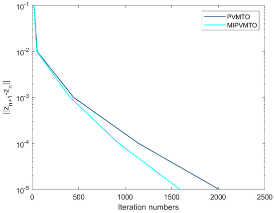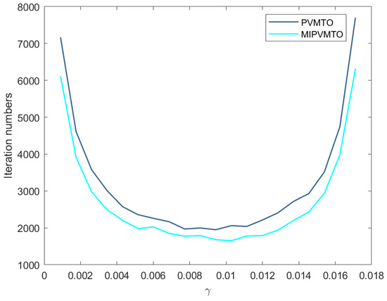 In Algorithms (13) and (26) take , , , and eps . The effect of choosing different on the number of iterations of the two algorithms is shown in Figure 3. It can be concluded that, when , the number of iterations of our two proposed algorithms is the least, and the number of iterations of MIPVMTO is less than that of the PVMTO.