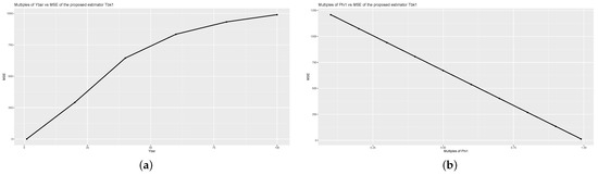 The of the proposed estimator obtained in (1) depends on the values of and , while the of the proposed estimators obtained in (4) depends on the values of and , when the population size is large. In the numerical study section, following [44,45], we will examine the effect of the variations of the , , and values on the of the proposed estimators.